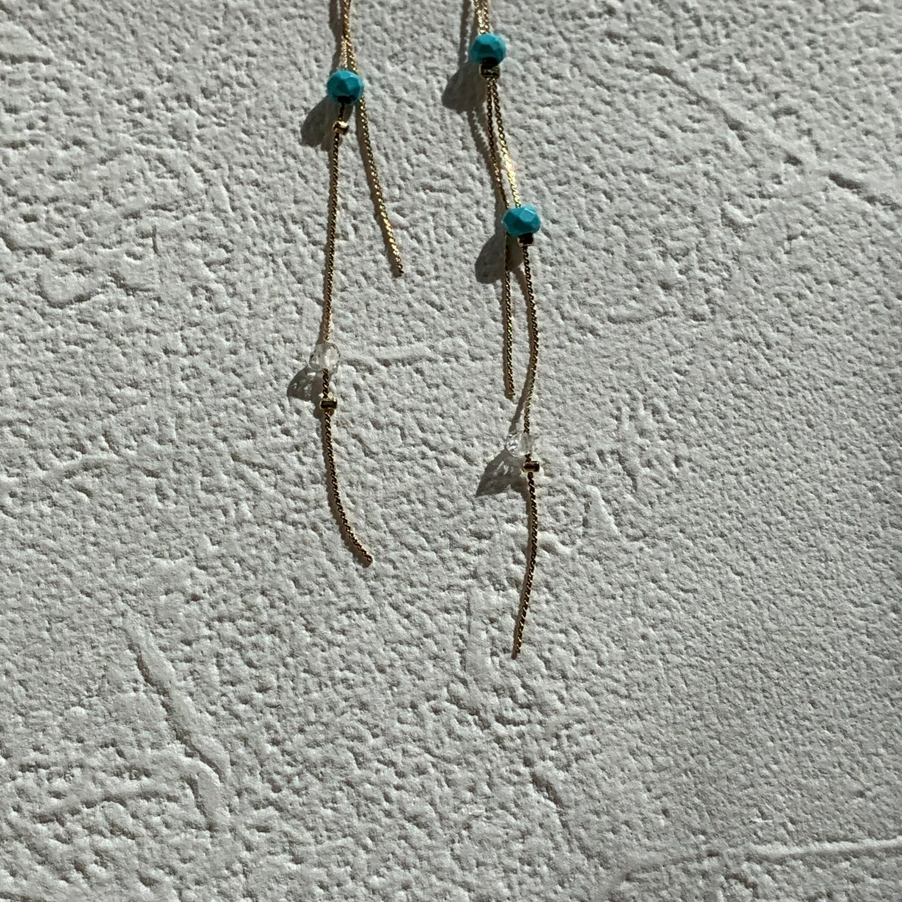 繊細な艶やかなチェーンに、ミニマムなturquoiseを使用し、Herkimer diamond quartzとの合わせで上品な仕上がりに。