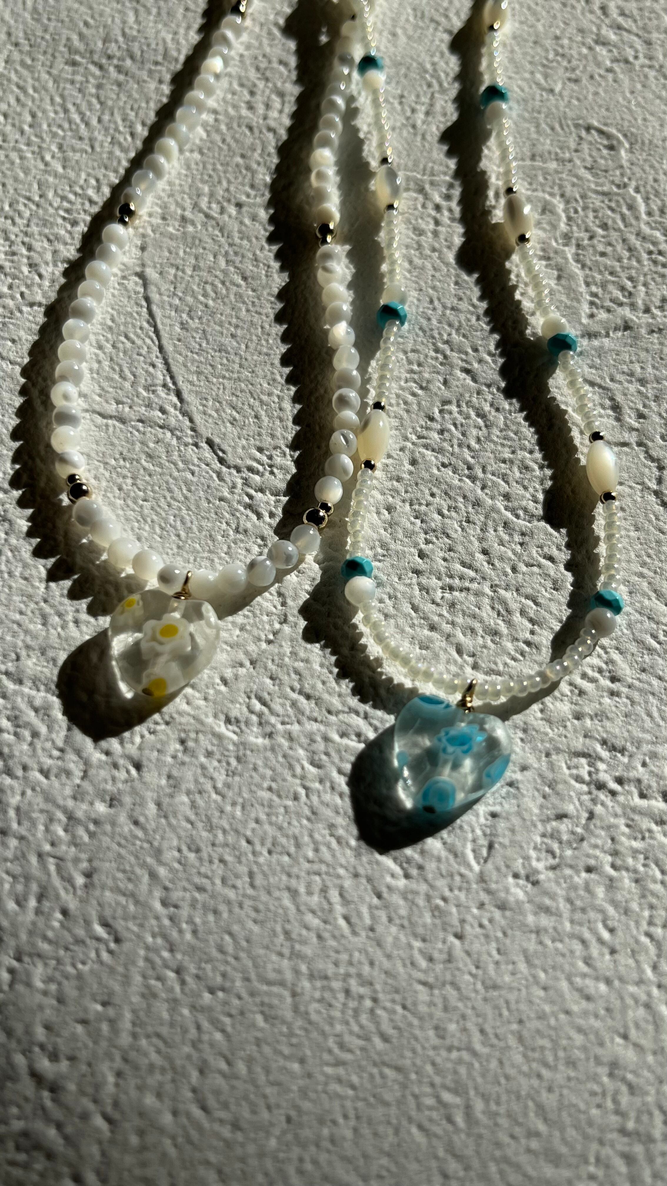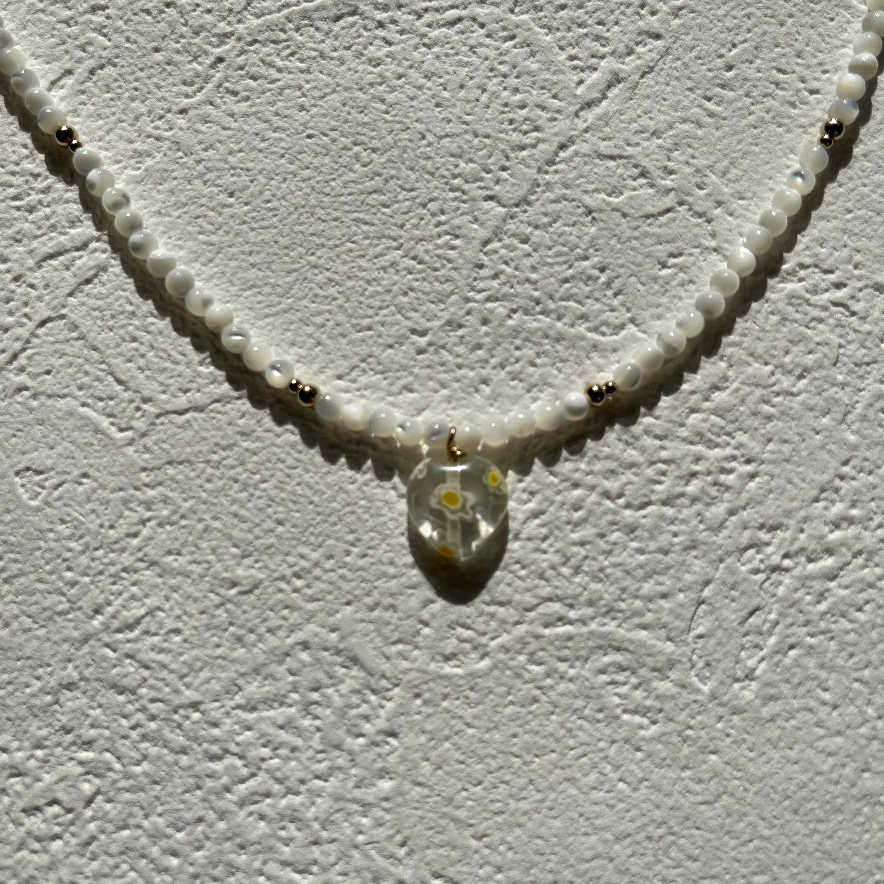 また、一つ一つ表情が違うshellは、角度によって光り方が違い胸元を明るい印象にしてくれます。